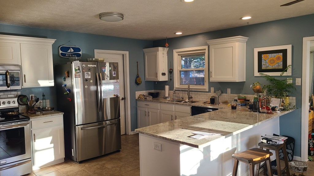 The kitchen has been upgraded with a huge granite countertop that is just gorgeous. White cabinets with new doors brighten the room. The laundry room off the kitchen also provides a roomy pantry. Tons of cabinets for the cooks pleasure. There is a spacious eat in kitchen with ample morning light to start your day and stools for the bar. A great space for not only family meals but game night too!